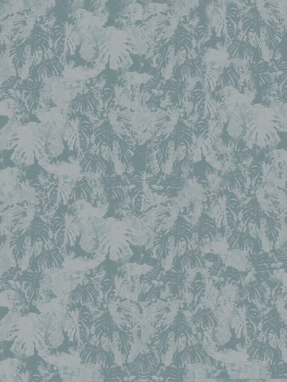 A tropical retro - inspired wallpaper, a dense foliage leaves an irregular mark on a background full of palms and changing colors. Shapes and bright tones create a texture that brings back to mind the reflections of fabric velvet. Elusive shapes and half-variegated tones make the surfaces vibrating and warm.
